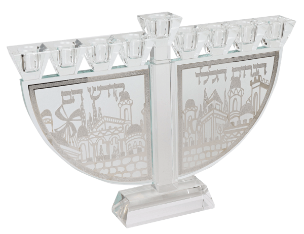 Crystal menorah With Silver Jerusalem Haneroth Haluli 9.5"H